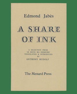 35. JABÈ, Edmond. A Share of Ink: A Selection from ‘Je Batis Ma Demeure.’ London: Menard Press, 1979.